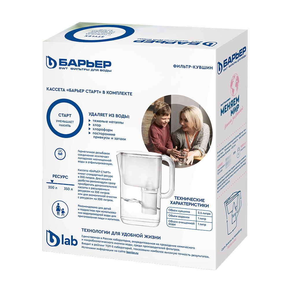 В комплекте с фильтром-кувшином кассета БАРЬЕР Старт. Она умягчает воду, уменьшая образование накипи, защищает от хлора и хлорорганических соединений, тяжелых металлов и других вредных примесей. Удаляет посторонние привкусы и запахи, улучшает вкус воды. Ресурс кассеты — 200 литров.