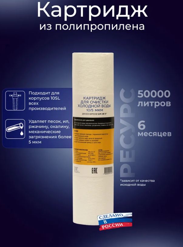 Устанавливать его можно как в магистральные фильтры (на всю квартиру/дом), так и питьевые системы (такие как тройные под мойку) – он подойдет во все корпуса типоразмера Slim Line 10” – это мировой стандарт фильтров для воды, который означает, что данный картридж имеет диаметр около 60мм (Slim Line значит 2,5 дюйма) и высоту около 250 мм (10 дюймов) Данный картридж достаточно тонкой очистки – 5 микрон. Картриджи из вспененного полипропилена более тонкой очистки встречаются только 1 микрон, все остальные грубее – 10, 20, 50 микрон.