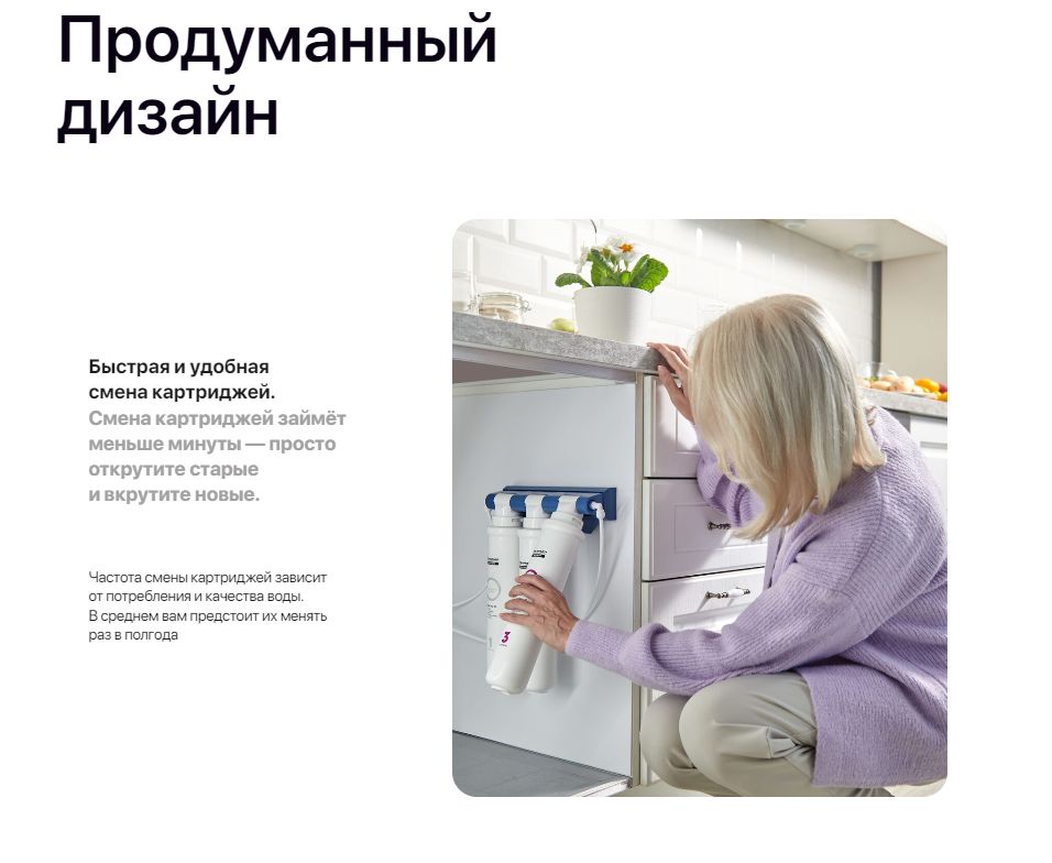 На первой ступени "Механика" Барьер очищает воду от песка, ржавчины, окалины, других механических частиц, а также предварительно очищает от нерастворимых механических примесей с тонкостью фильтрации 5 мкм. На втором этапе "Ионообмен" уникальная фильтрующая смесь обеспечивает высокую эффективность очистки от тяжелых металлов (меди, винца, кадмия) на протяжении всего ресурса фильтра. На третьем этапе "Посткарбон" гранулированный уголь, обработанный серебром, устраняет вредные примеси (хлор, хлорорганические соединения, органические соединения, неприятные запахи), улучшаются вкусовые качества воды. Характеристики: